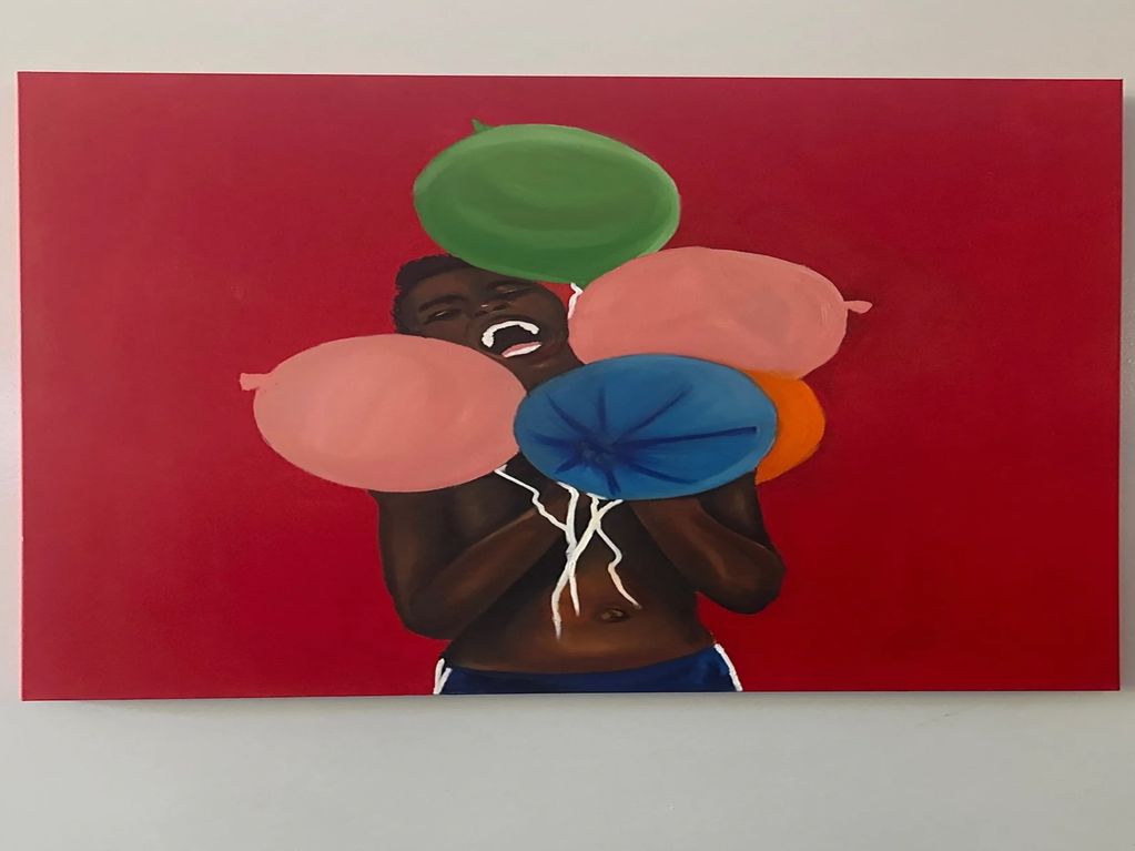 Balloon Bliss- In a world that often asks us to be heavy, this man chooses to find the light. A man stands against a red sky, holding five balloons line tiny planets of possibility, his smile stretched wide enough to feel contagious.